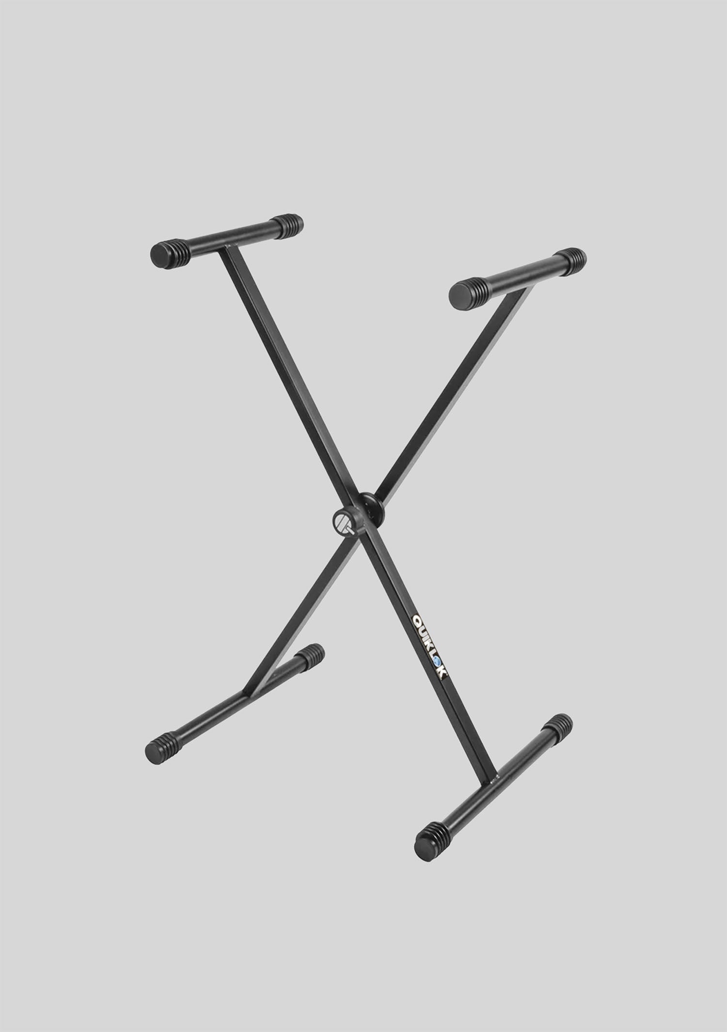 Atril tipo X resistente con bloqueo rápido T-Rex, diseñado para teclados de cualquier tamaño y peso.