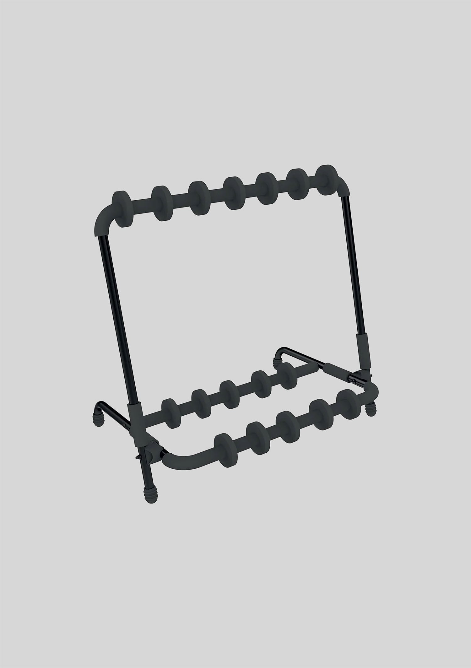 Atril múltiple robusto para almacenar hasta 6 instrumentos, ideal para estudio y escenario.