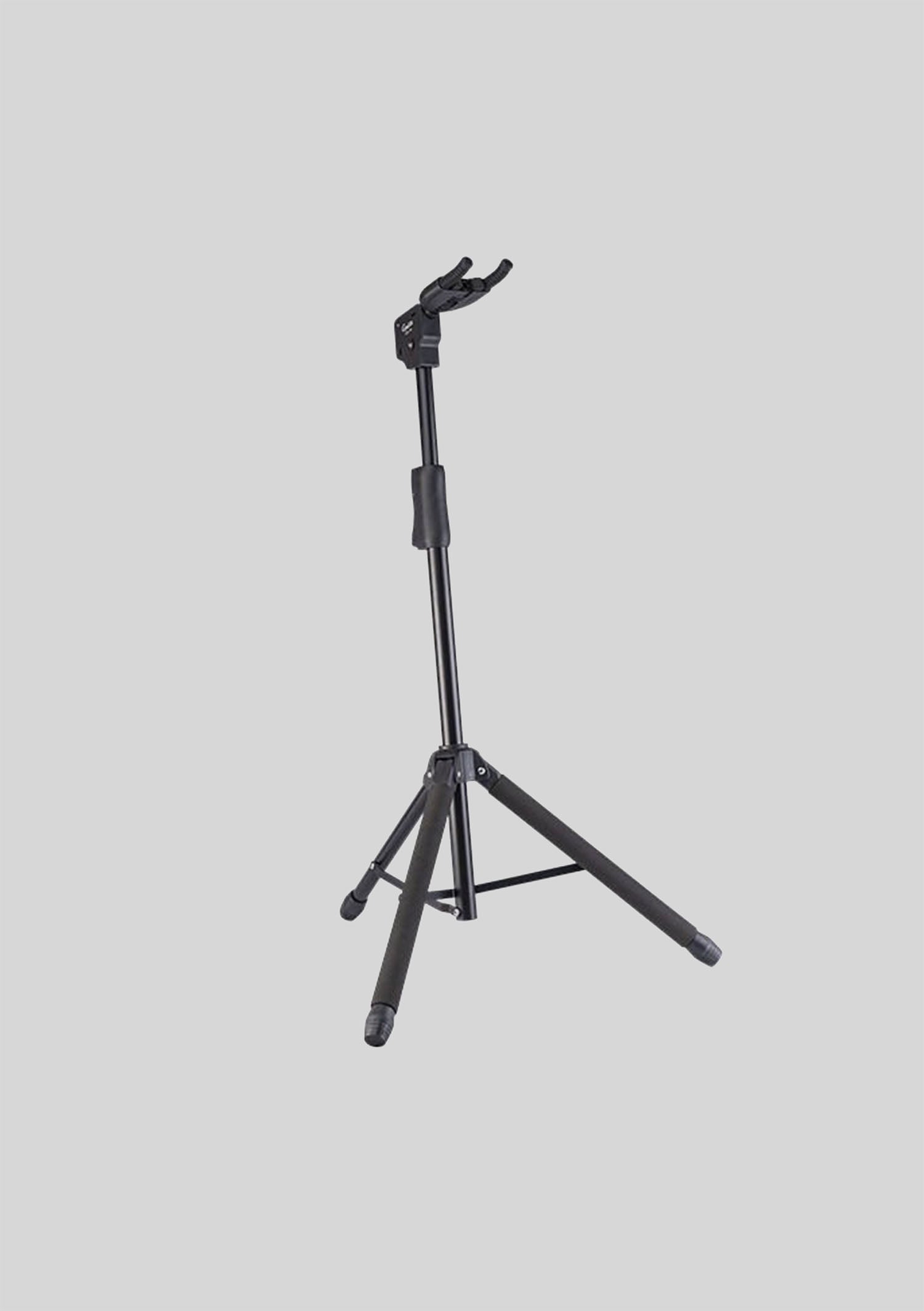 Soporte portátil y liviano diseñado para guitarras y bajos, fabricado con materiales resistentes que aseguran estabilidad y protección. Su sistema plegable facilita el transporte y almacenamiento, ideal para músicos en movimiento o uso en casa.