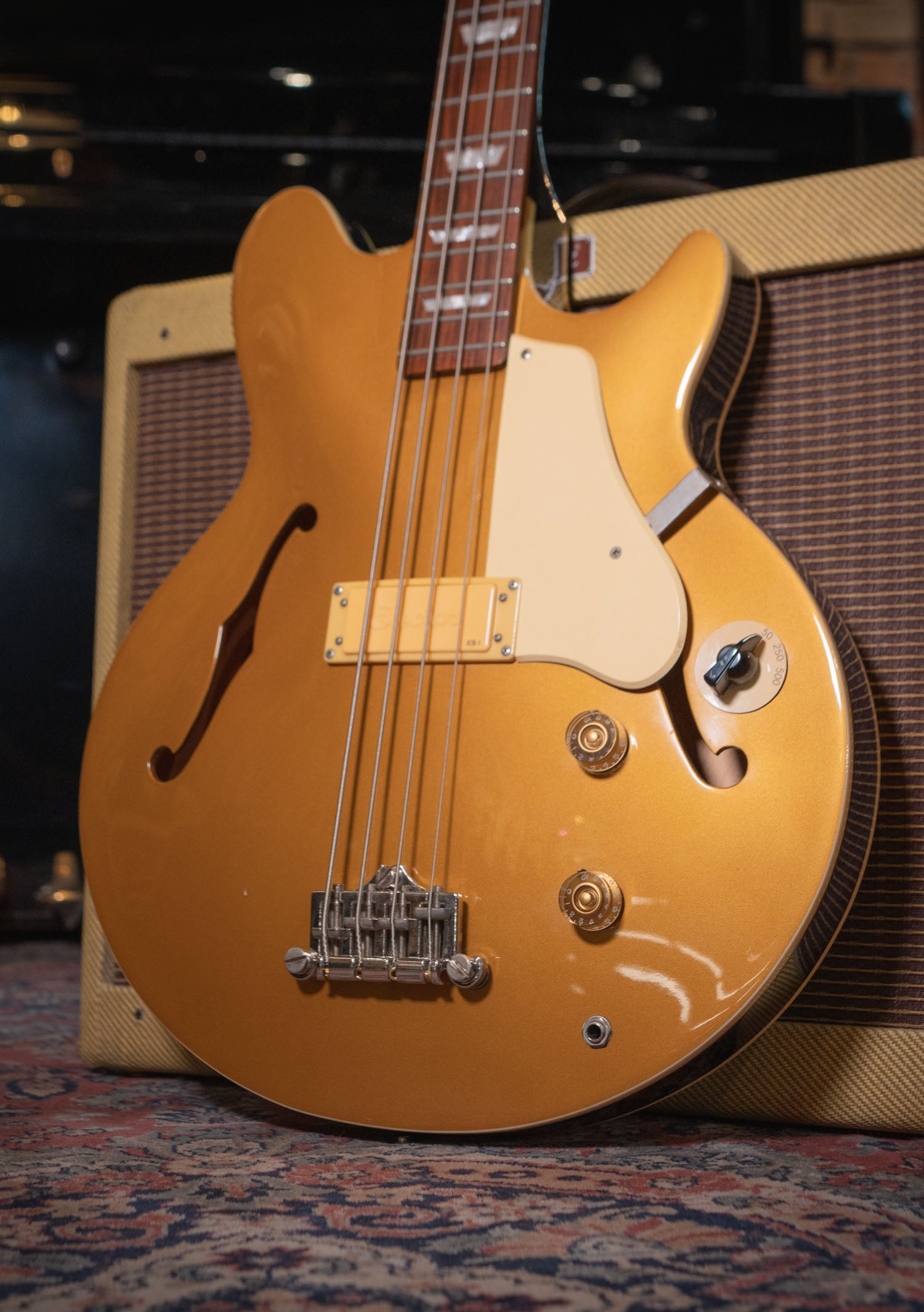 Bajo eléctrico semi-hueco de 2013 en acabado dorado, firmado por el legendario bajista Jack Casady. Ofrece un tono cálido y potente, ideal para estilos versátiles. Presenta signos leves de uso pero funciona perfectamente y mantiene su sonido vintage característico.