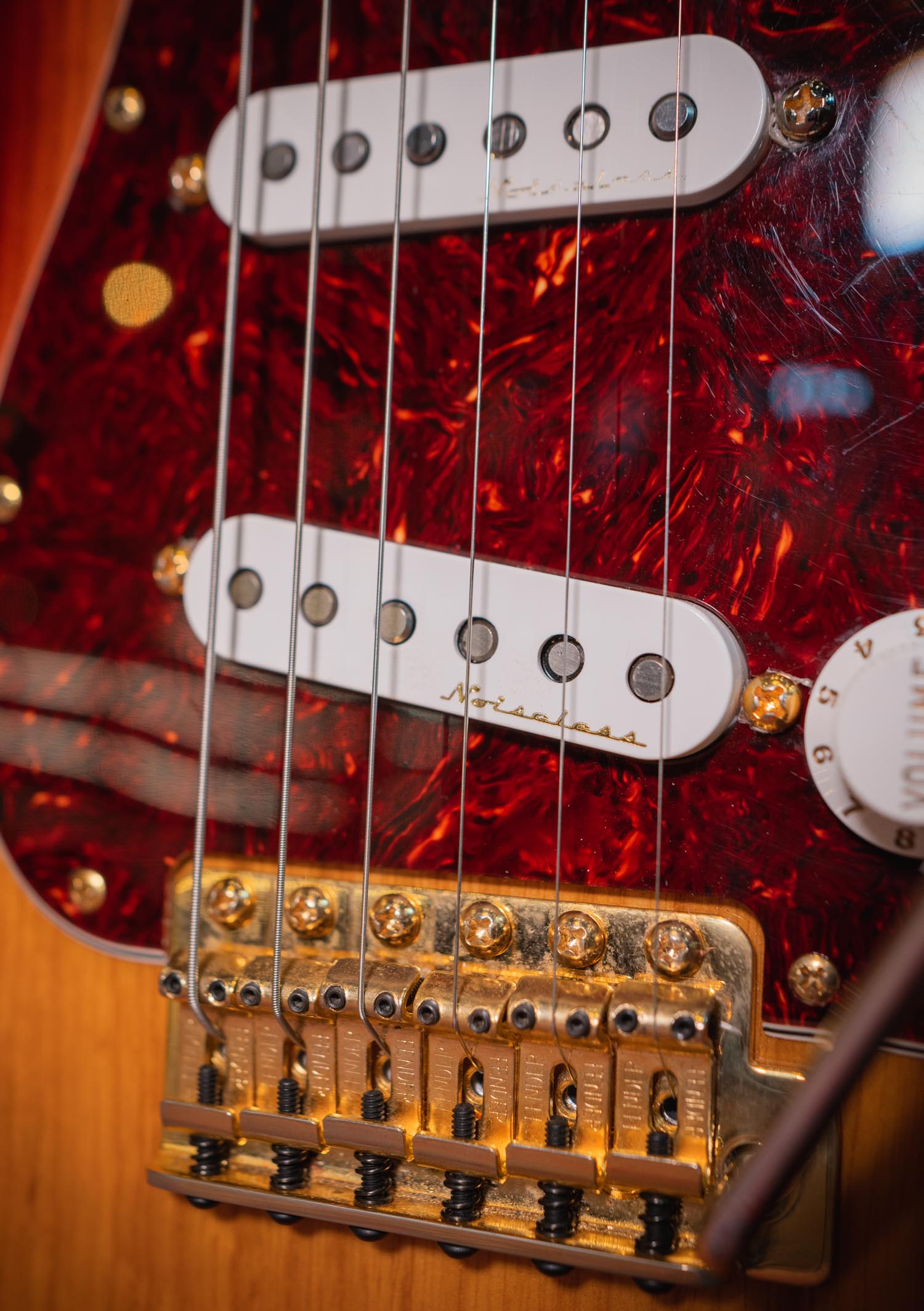 Equipada con tres pastillas Vintage Noiseless, logra un tono limpio y sin zumbidos, ideal para estilos como blues, rock y pop. Además, incluye un botón de activación que habilita combinaciones adicionales de pastillas, ampliando las posibilidades sonoras más allá del selector tradicional de 5 posiciones. El puente trémolo sincronizado de estilo vintage añade un toque clásico sin comprometer la afinación.