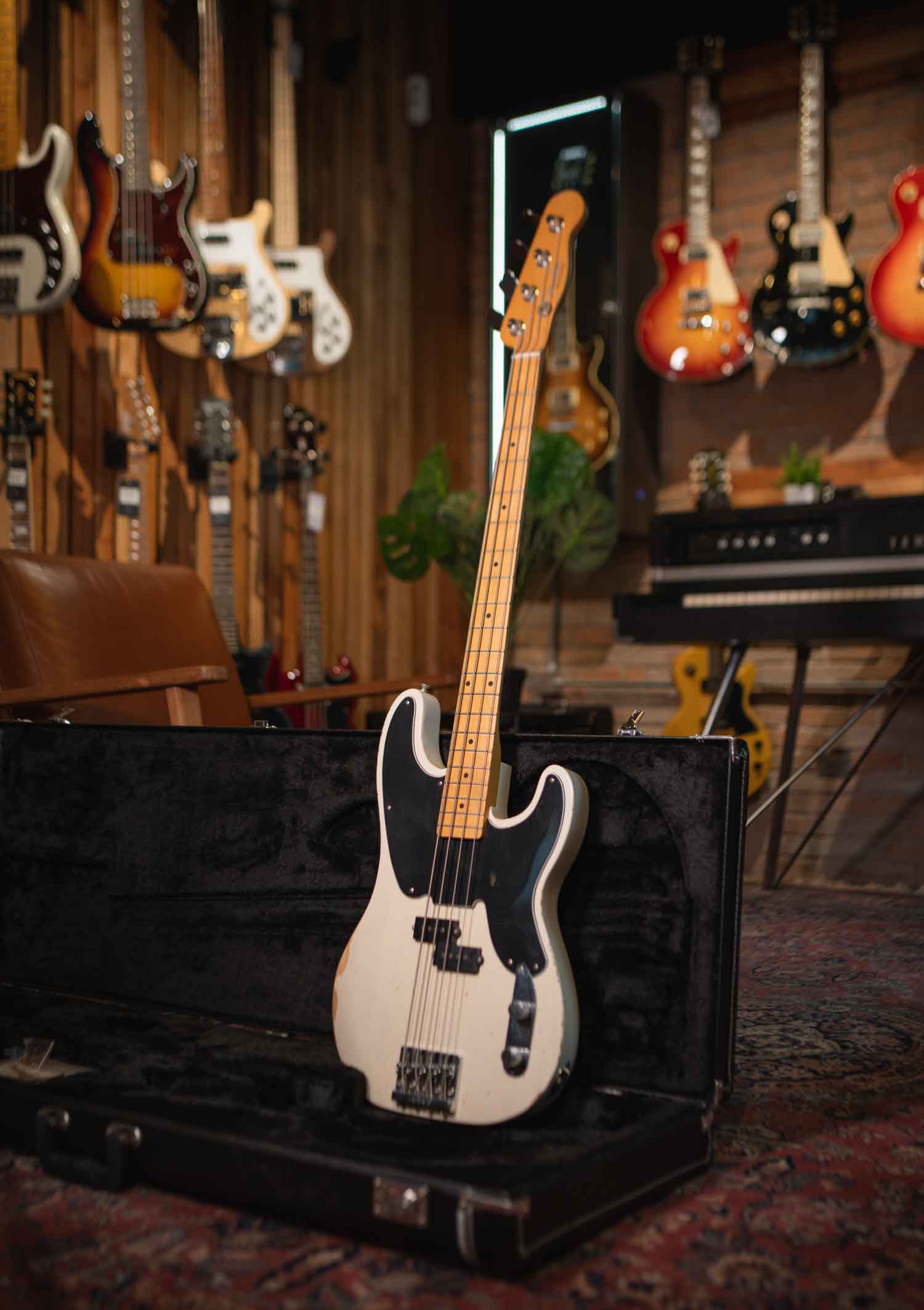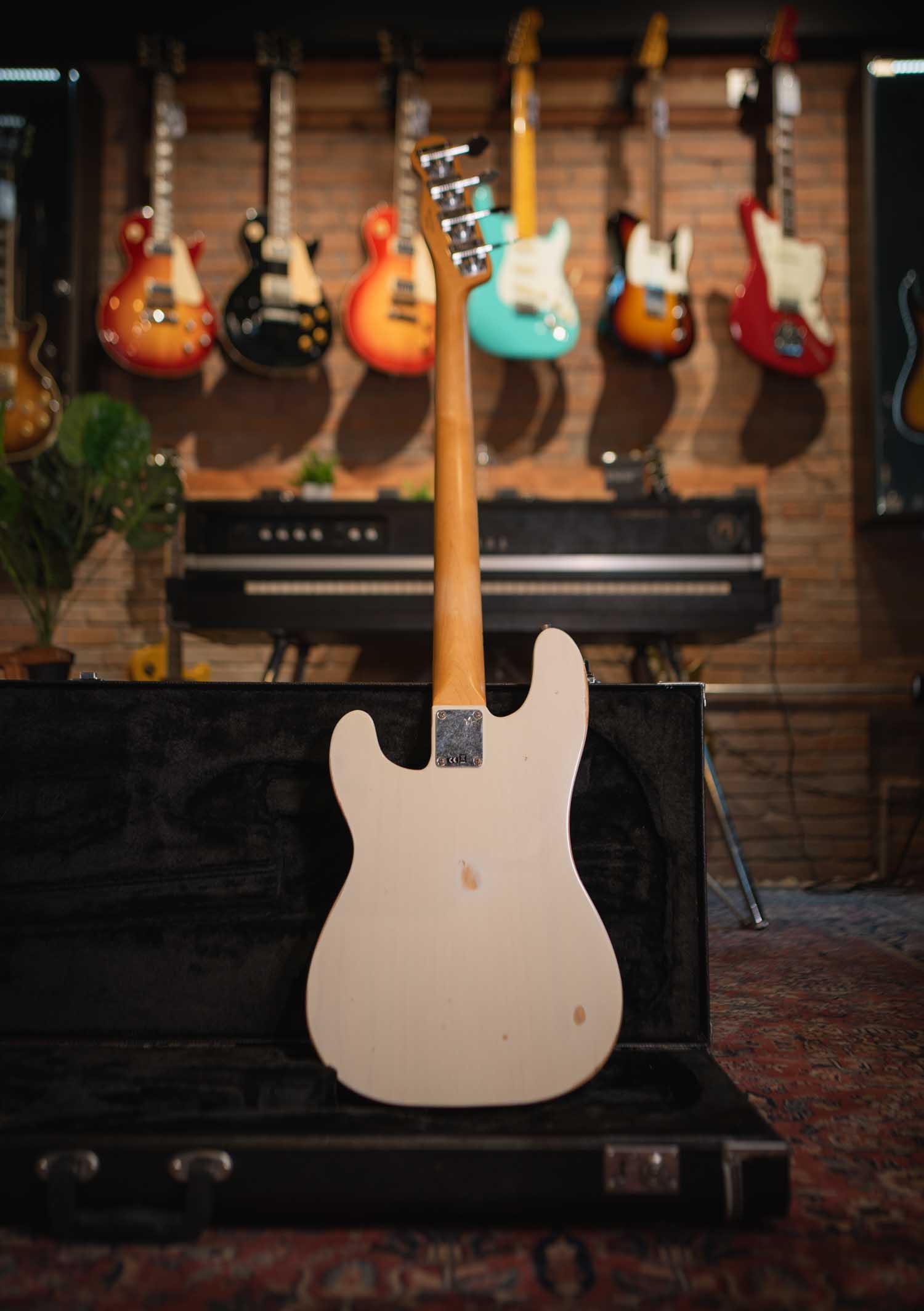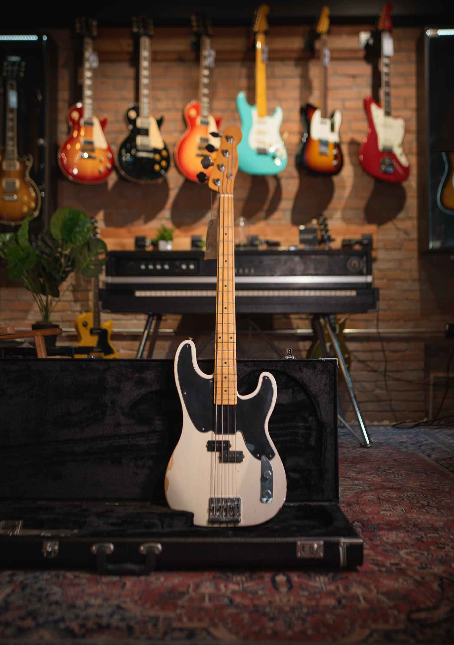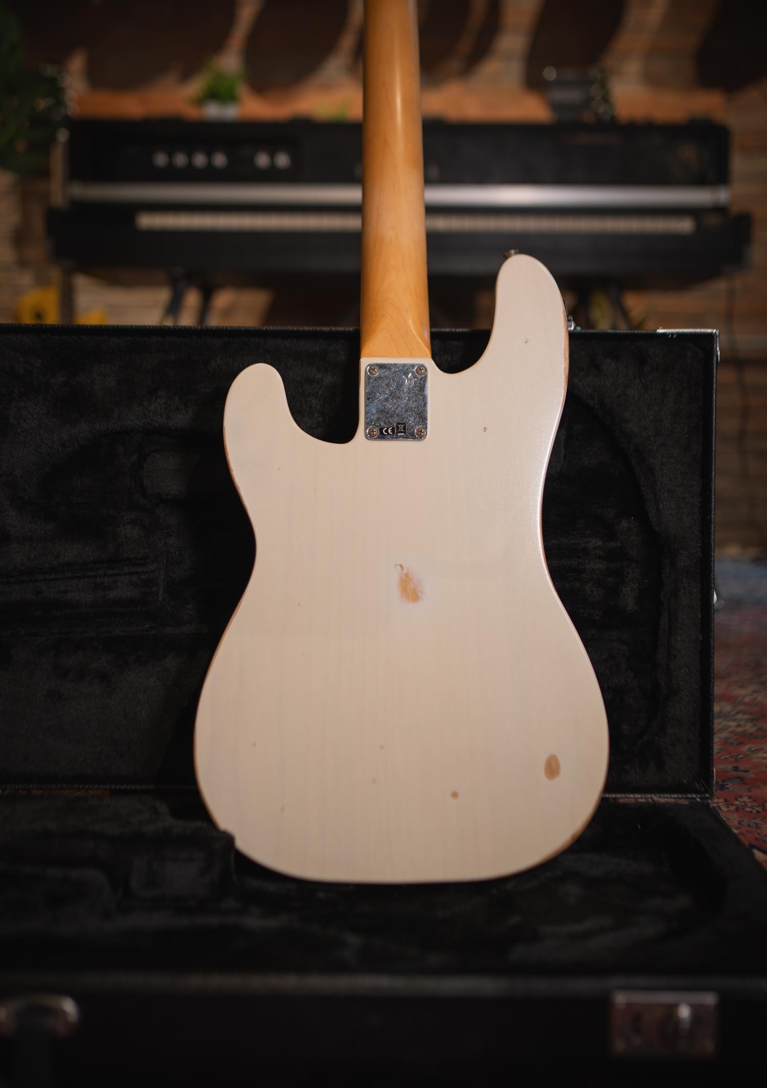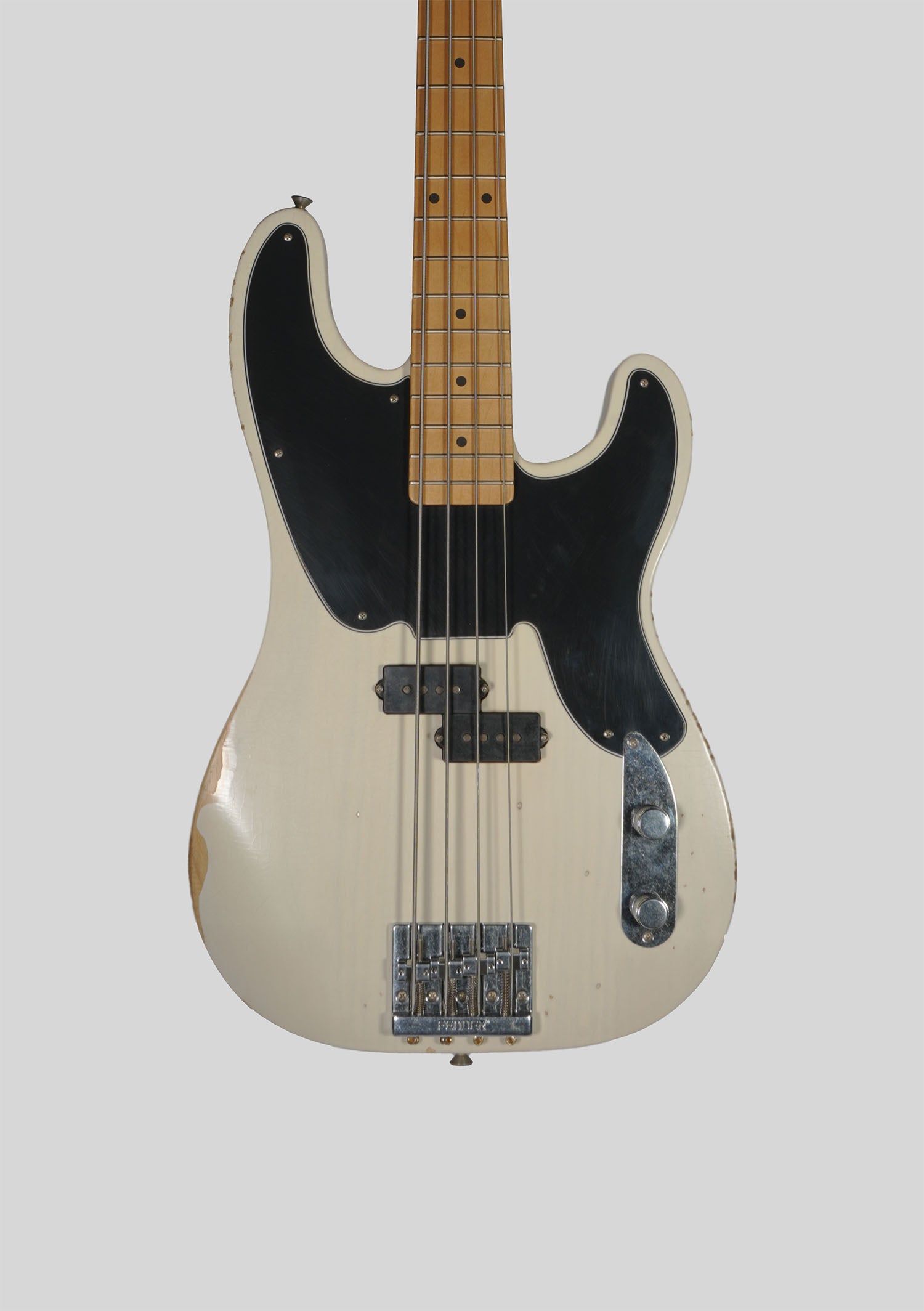 Bajo eléctrico exclusivo inspirado en el bajista de Green Day, con acabado envejecido White Blonde, excelente construcción y tono potente. Fabricado en 2018, cómodo y confiable para escenarios o estudio.