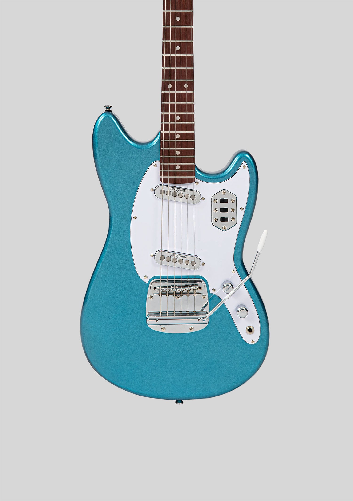 Guitarra eléctrica con doble cápsula single coil, diseño moderno y acabado Baywin Blue. Tono versátil, claro y dinámico.