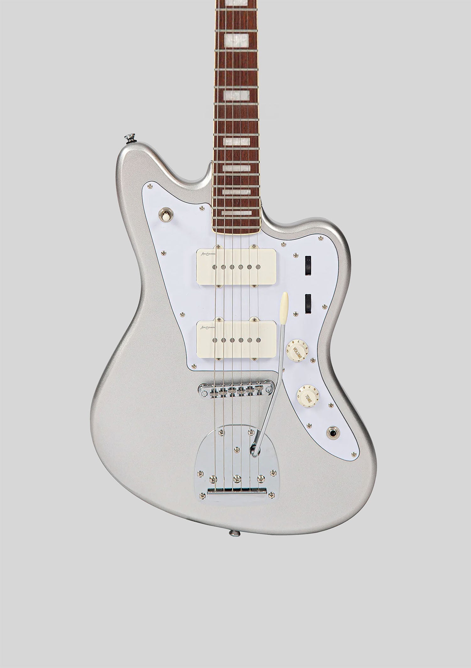 Guitarra eléctrica offset con cápsulas P90, acabado Metallic Silver. Sonido brillante, definido y estilo vintage alternativo.