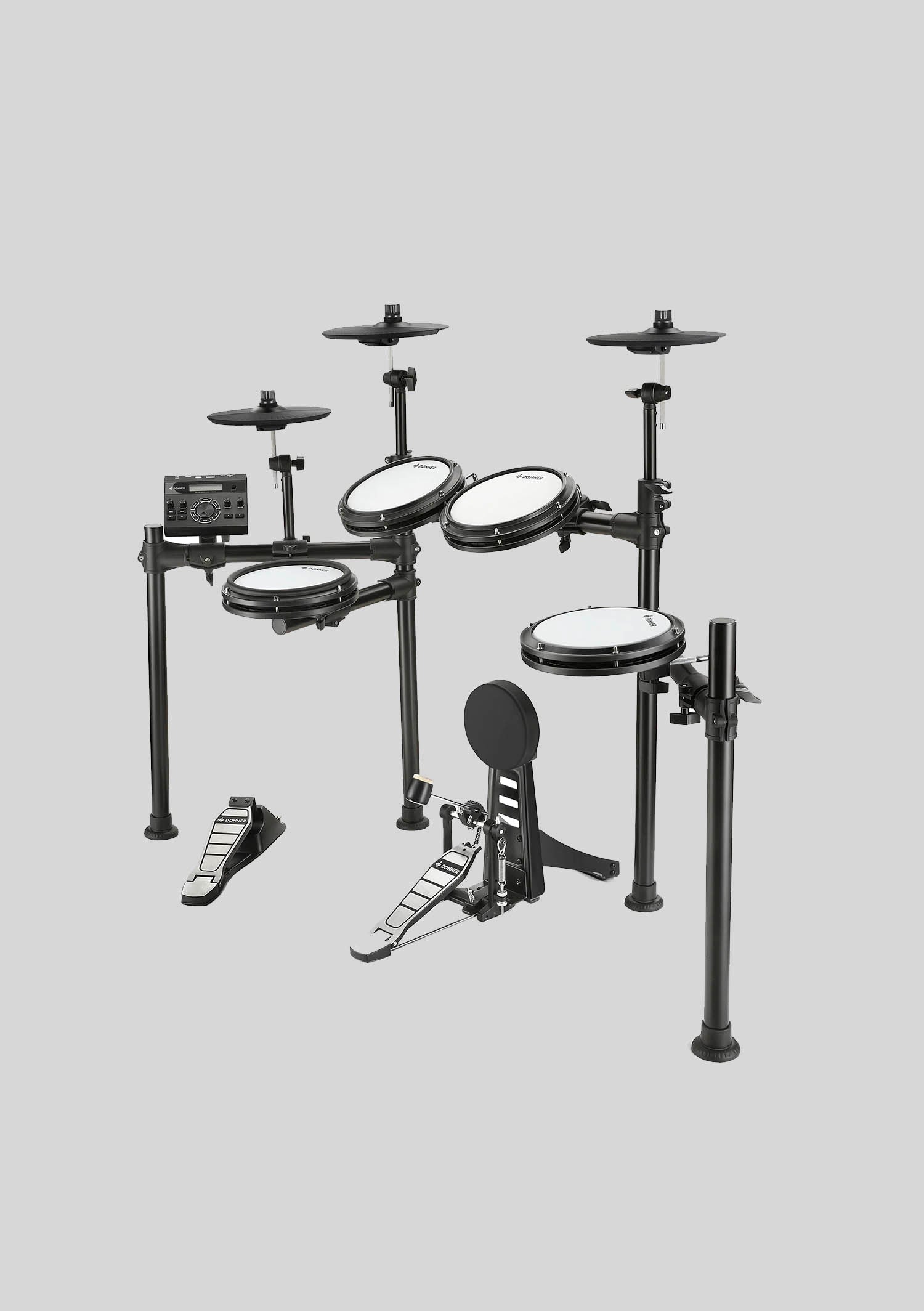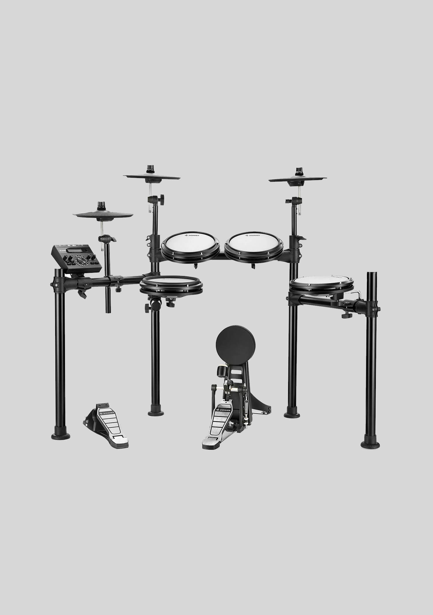 Set de batería electrónica intermedia con pads sensibles, módulo de sonidos variados, incluye audífonos y sillín ajustable.